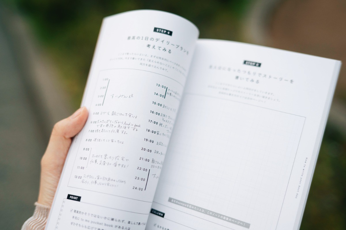 自分の思う朝起きてから夜寝るまでの「最高の1日」を書きながら、5つのSTEPに沿って理想を現実へと変えていく全50Pのノートになります。