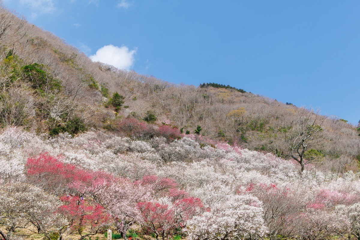 今年で第31回目を迎える「梅の宴」は、雄大な幕山を背景に約4000本の紅梅・白梅が紅白の絨毯のように咲き誇る、湯河原の春の風物詩。