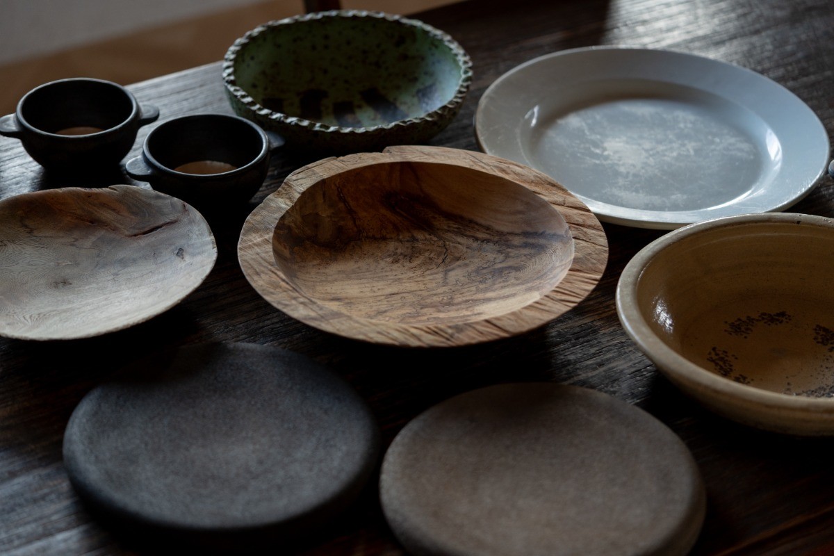 器には宮城陶器、bonoho、陶房眞喜屋、藤本健ほか県内の作家やアンティークを中心に揃えています