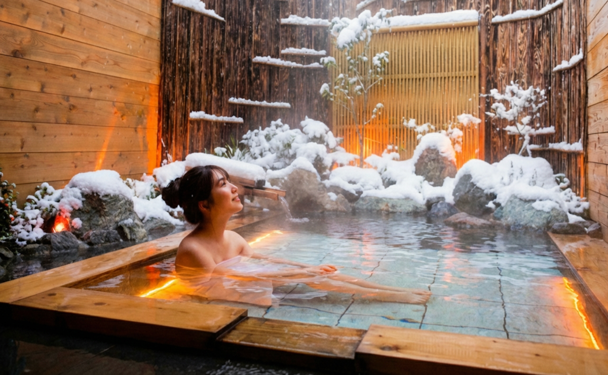 7:00 朝の内湯で静かに目覚める澄んだ空気の中、柔らかな湯に身を沈め、瞑想のように穏やかな時間を過ごします。