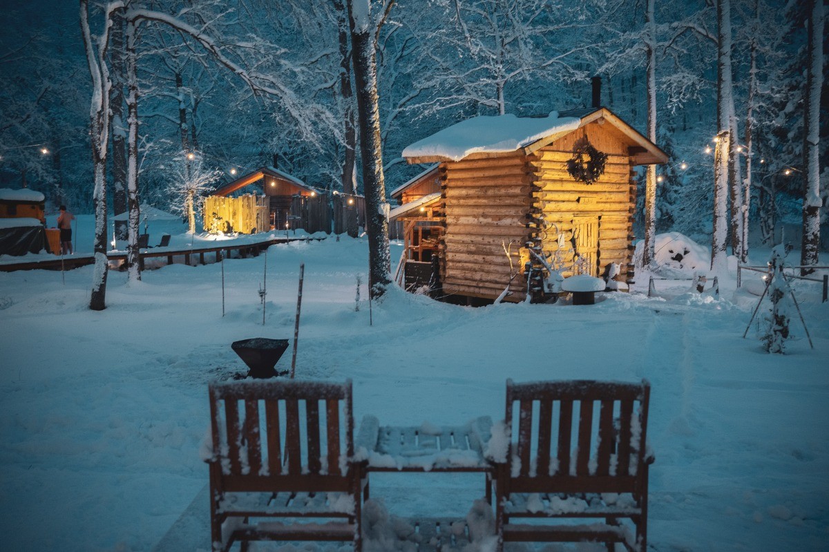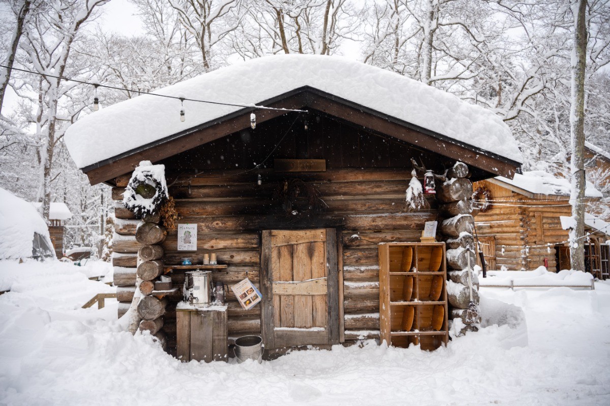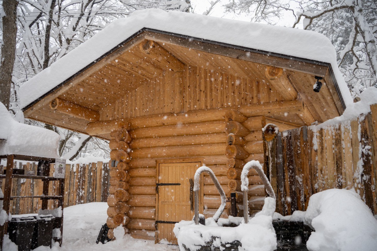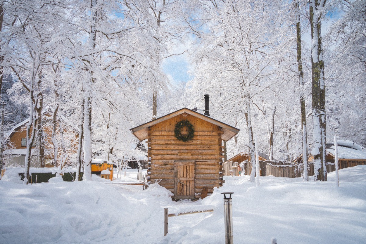 サウナの目の前に外気浴スペースが広がっています。白銀の世界での森林外気浴をお楽しみ下さい。
