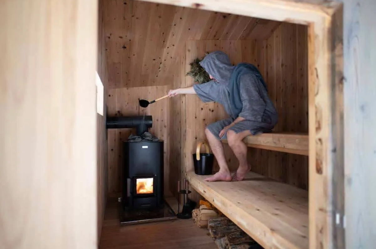 The wood-burning stove is the heart of the sauna.