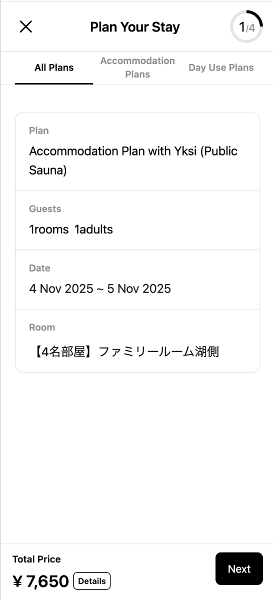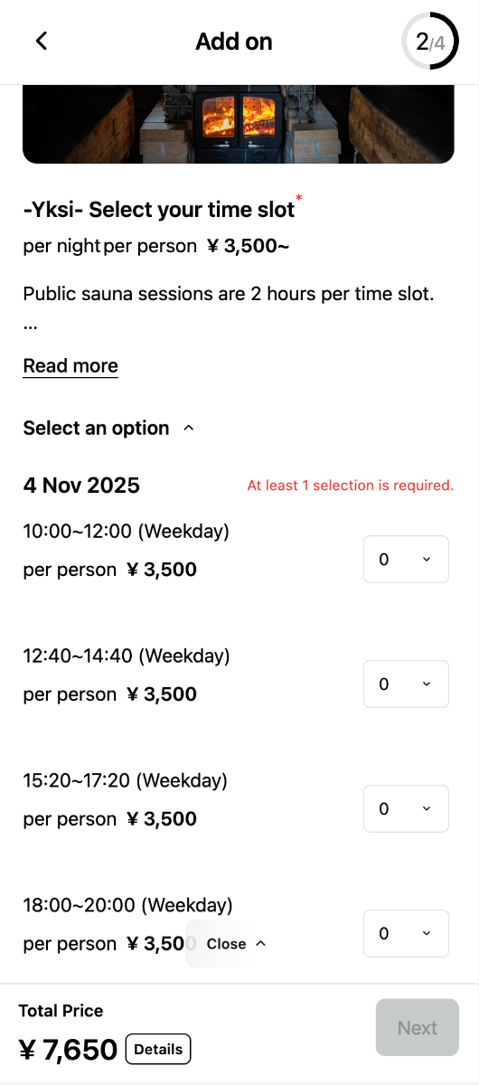 A. Each accommodation plan allows booking only one sauna slot. If you want additional sauna sessions, please book separately here: [Totonoeru – Authentic Finnish Sauna Experience]