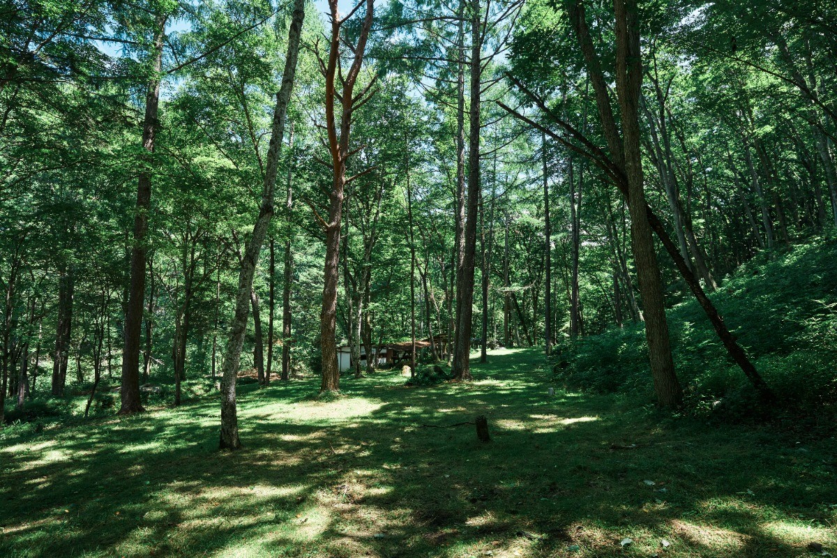 ist - Aokinodaira Loungeや炊事場・トイレ・シャワールームが近くにあり、道から少し高台にあるためプライベート感もしっかり感じられる林間サイト。