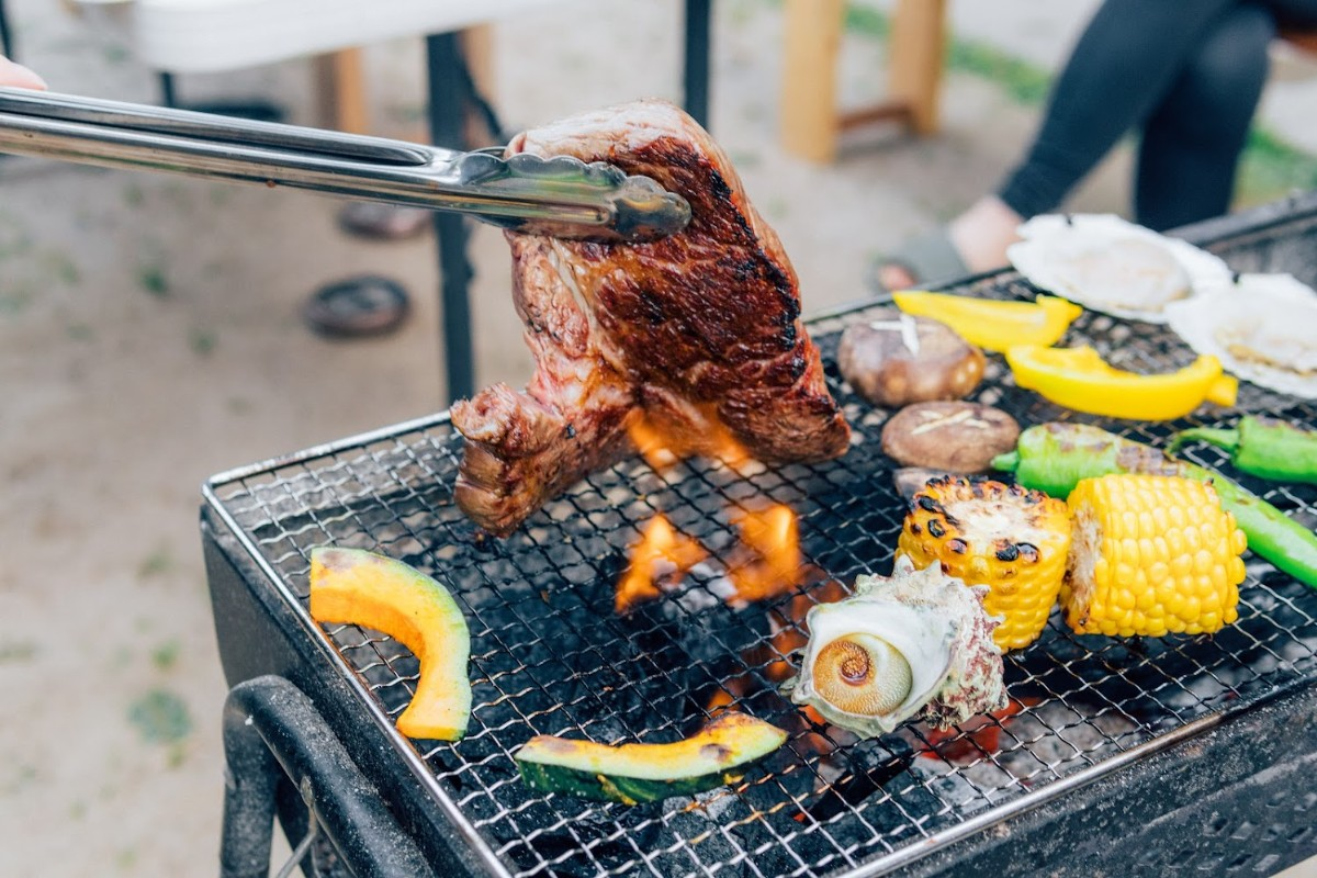 「自分達で食材を持ち込みたい!」という場合は、BBQレンタルセット(網、炭、トング、食材持ち込み料)を1グループ2,000円でご利用ください。[現地決済]