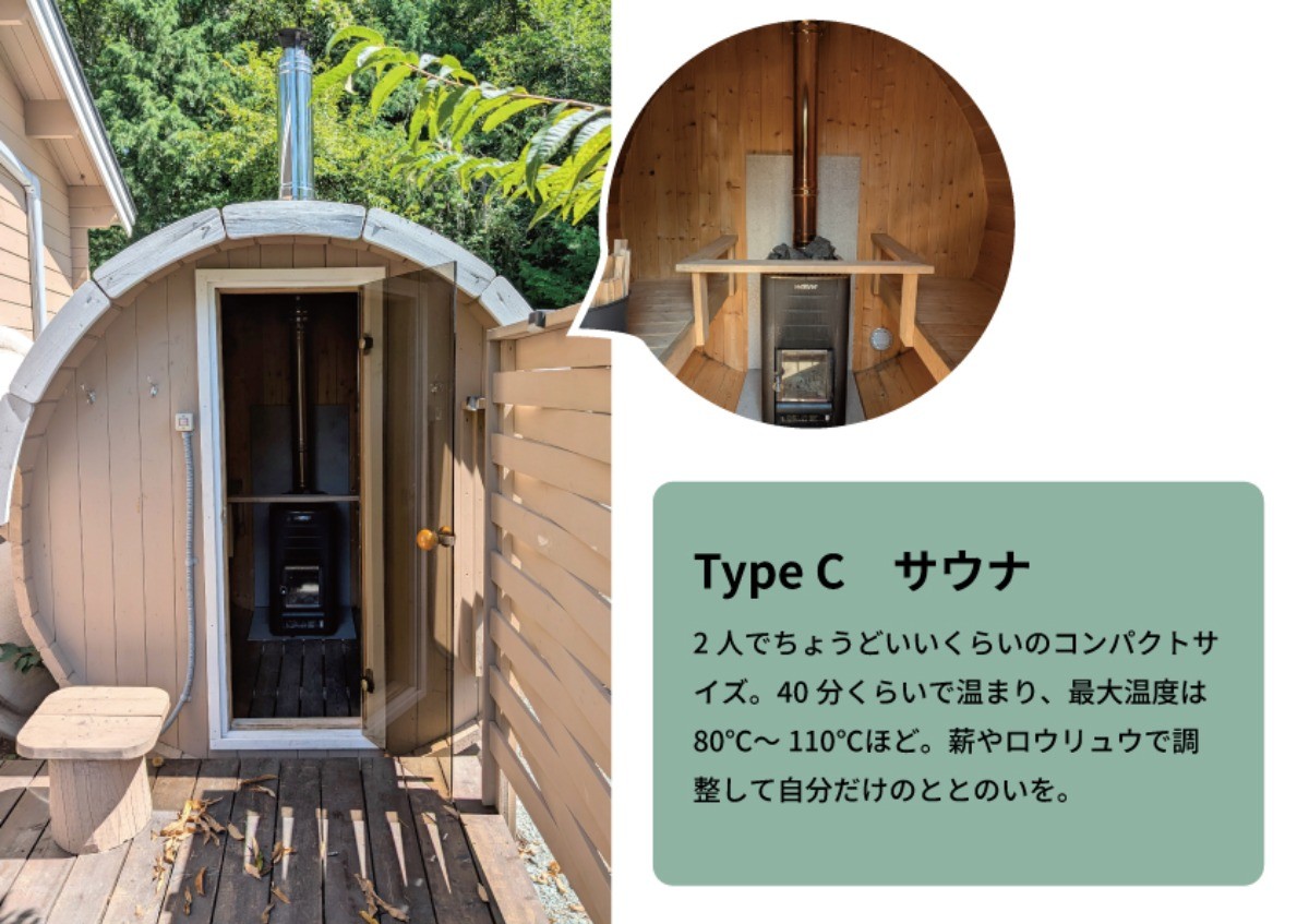 1番人気のオーバルサウナがあるお部屋。寝室のお部屋と同じくらいな大きさのサウナ。ゆったりとしたサウナと、屋根付きのBBQスペースでスローライフ体験を楽しめます。