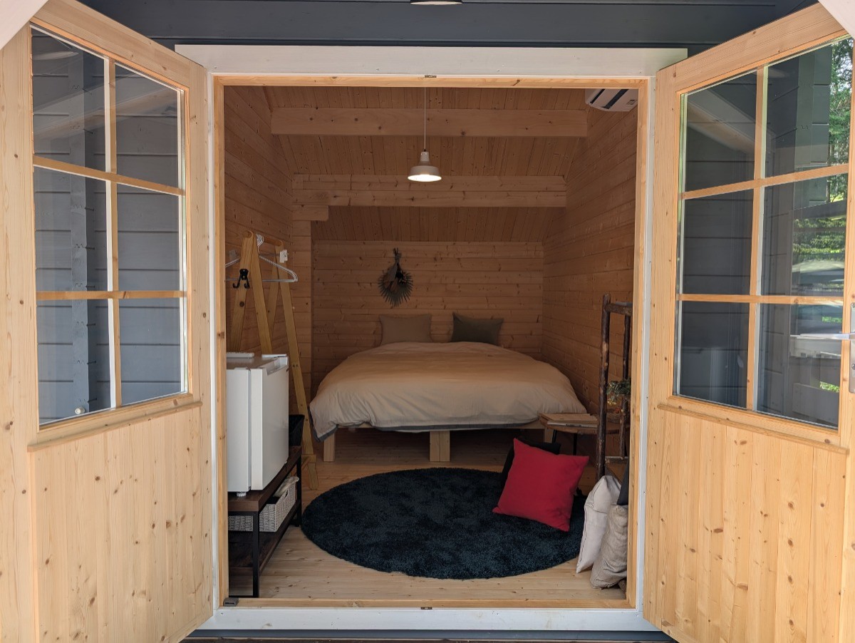 FIRESIDEのギアと楽しむ薪料理小さなベッドルームと全デッキで雨でも汚れないお部屋で、ちょっと贅沢なアウトドア体験をしませんか?サウナも水風呂も2人でちょうどのサイズ。サウナの熱は最高100℃前後です。ロウリュウで調節しながらお楽しみください。