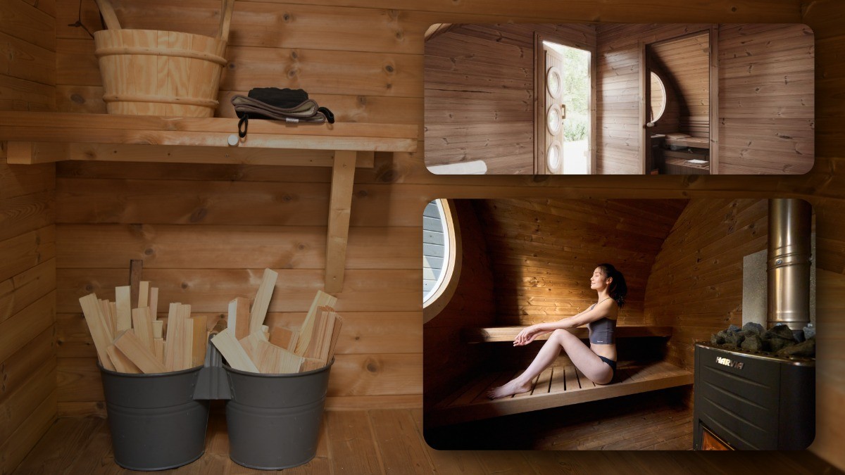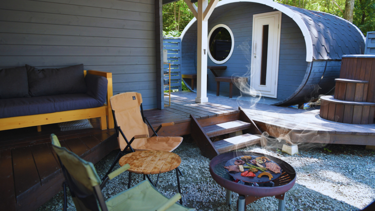 寝室のお部屋と同じくらいな大きさのサウナ。ゆったりとしたサウナと、屋根付きのBBQスペースでスローライフ体験を楽しめます。