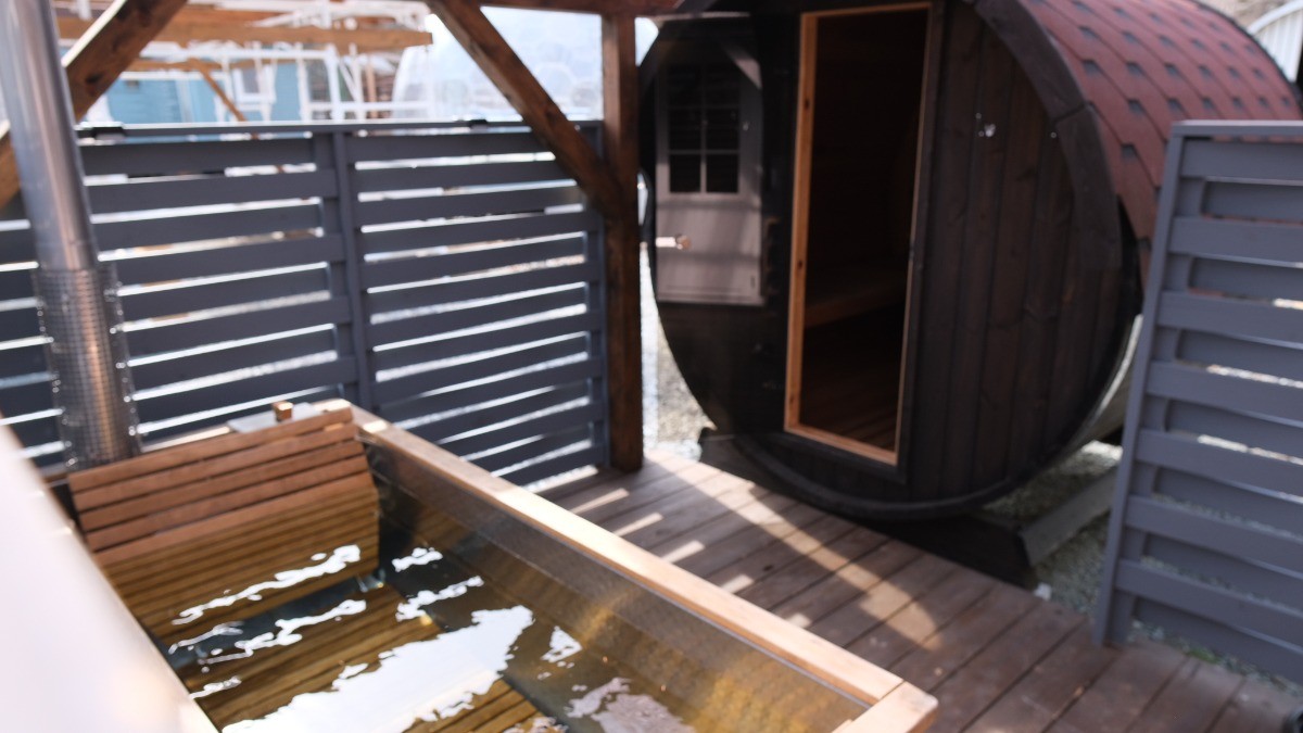 サウナも水風呂も2人でちょうどのサイズ。サウナの熱は最高100℃前後です。