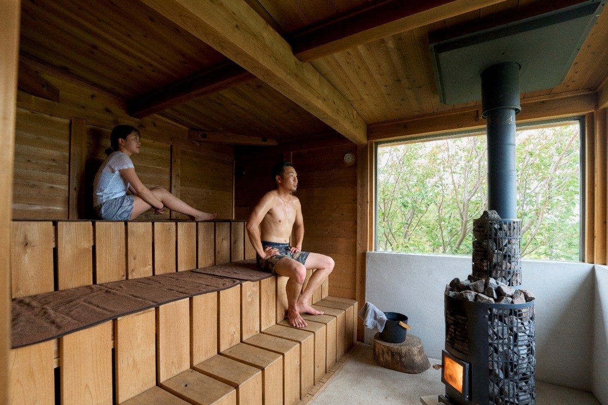 火のゆらめきと窓から見える絶景とともに本格的なフィンランド式サウナを利用できます。サウナの外には海を一望できるデッキスペースがあり、紺碧の日本海を望みながら外気浴を堪能できる特別な空間です。