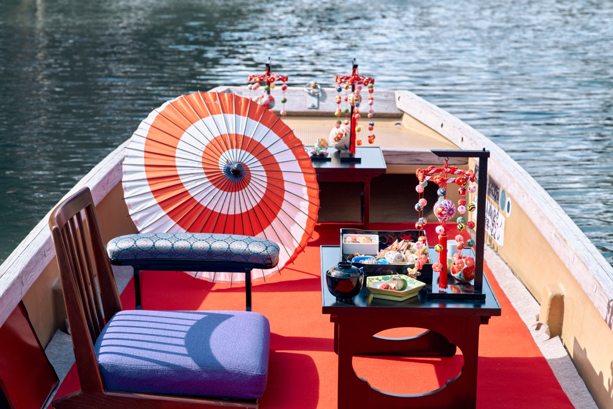 お舟には小さなさげもんや柳川まりをしつらえ、赤い毛氈と和傘が春の光に映える特別貸切舟に。
