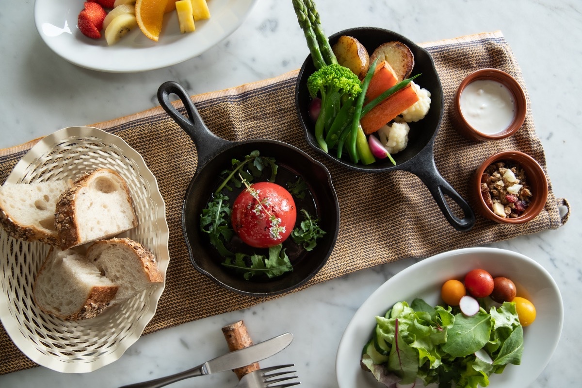 桜岡近郊提携農家さん直送の新鮮なオーガニック食材をスキレットやストーブで素材の美味しさを逃さずに調理する料理をメインとした「ファームトゥテーブル」の朝食です。果物、卵料理、パン又はライス、ドリンク、スープなどもついてます。窓からやさしく差し込む朝陽を浴びて、健康的で身体や心にも美味しい朝食をお楽しみください。