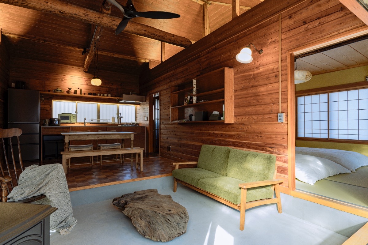 懐かしさや温かさを感じさせてくれる壁や床はそのままにしつつも、土間を用いたリビングや立派な梁を活かした天井、選りすぐりのアンティーク家具や古家具等を加え、"古き良き懐かしさ"と"普段の生活空間にはない新鮮さ"の両立を目指した。