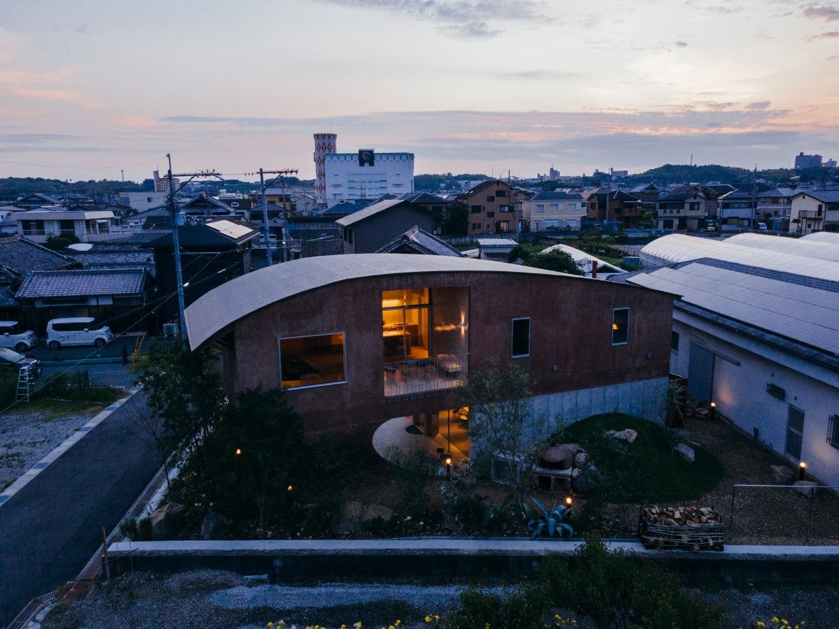 路地を入った狭い道を進むと、柔らかなカーブを持つ屋根と赤い外壁が特徴的な建物が現れます。「工芸建材がある暮らし」を、1棟貸しの宿で体感できる施設として新築し、2025年3月にオープンしました。