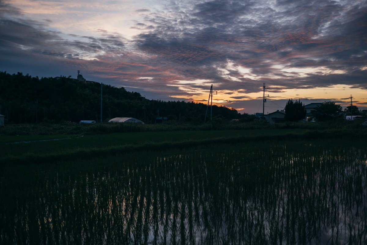 視界を遮るものが少ない、ひらけた田畑に沈む夕日