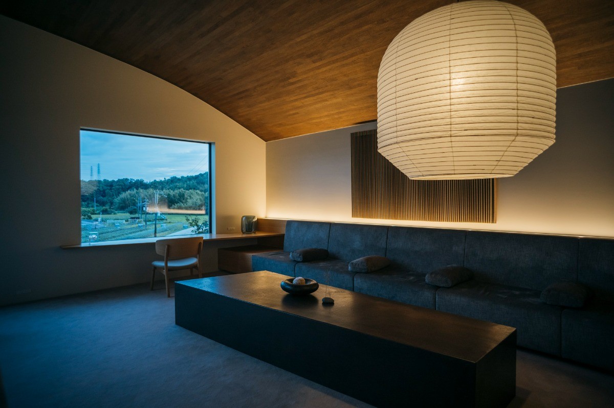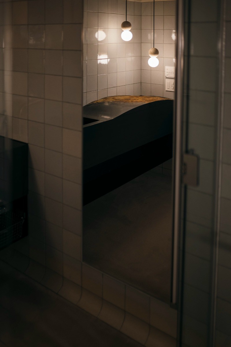 ピクチャーウィンドウから、移り変わる空をただただ眺める照明に照らされたタイルの美しさ、織物壁紙の奥行きと温かみ、漆の静かな存在感、変わりゆく光と工芸建材の表情の変化を、時間をかけて体感していただきたいため、明るいうちに、できれば17時までにお越しいただくことをおすすめしています。