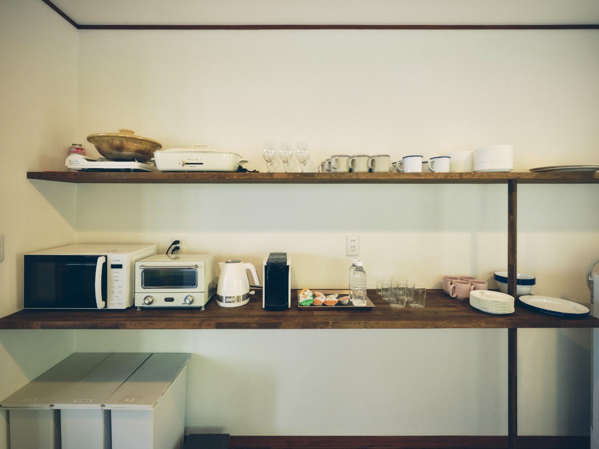 こだわりの食器やグラスなどをご用意。カプセルコーヒーのサービスもございます。またキッチンには調理器具やカトラリー類、調味料(油、塩胡椒、醤油)も揃えております。