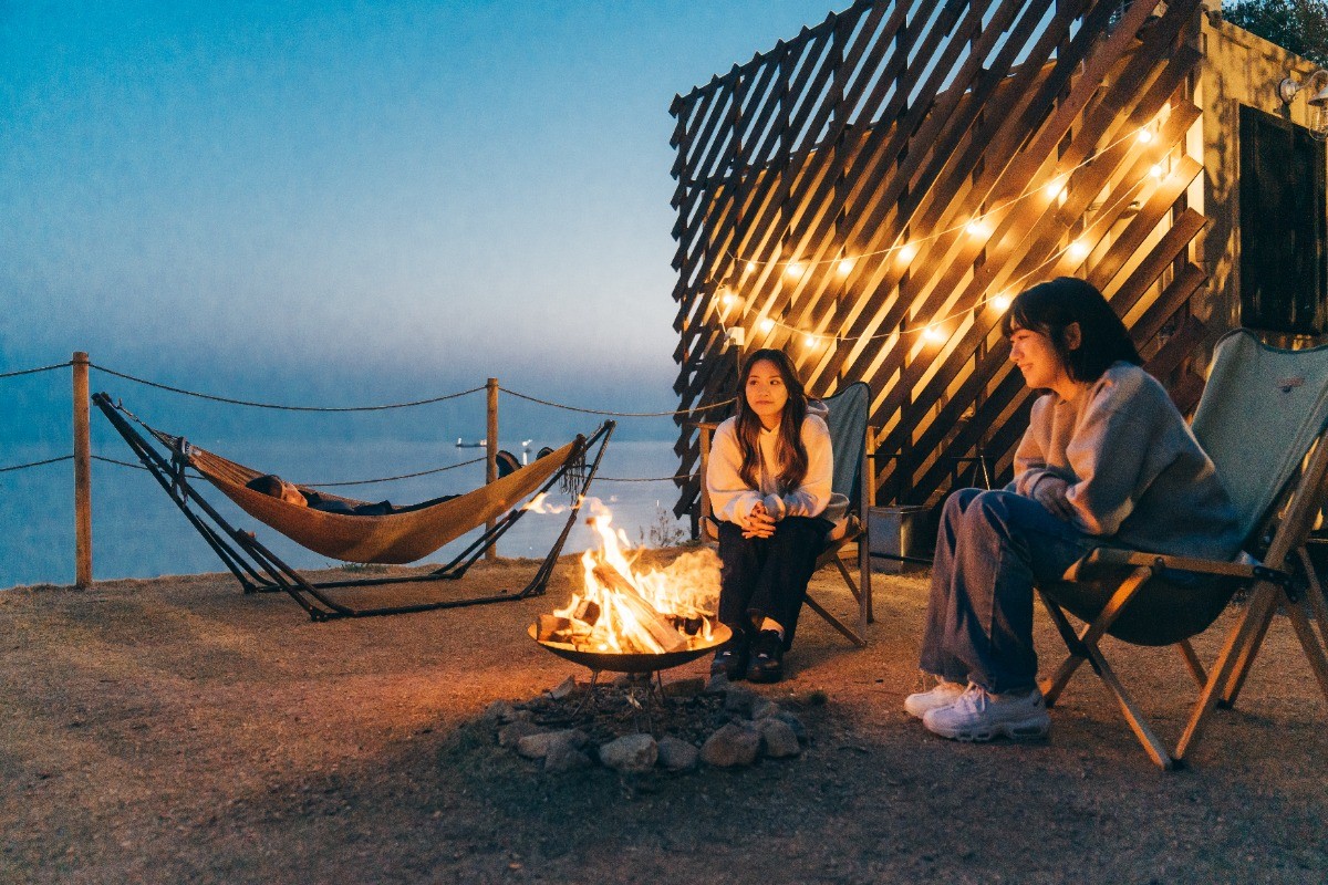 高台にある全室オーシャンビューのテントサイト、デッキサイトでのBBQや、瀬戸内海が一望できるオリジナルバレルサウナをお愉しみいただけます。