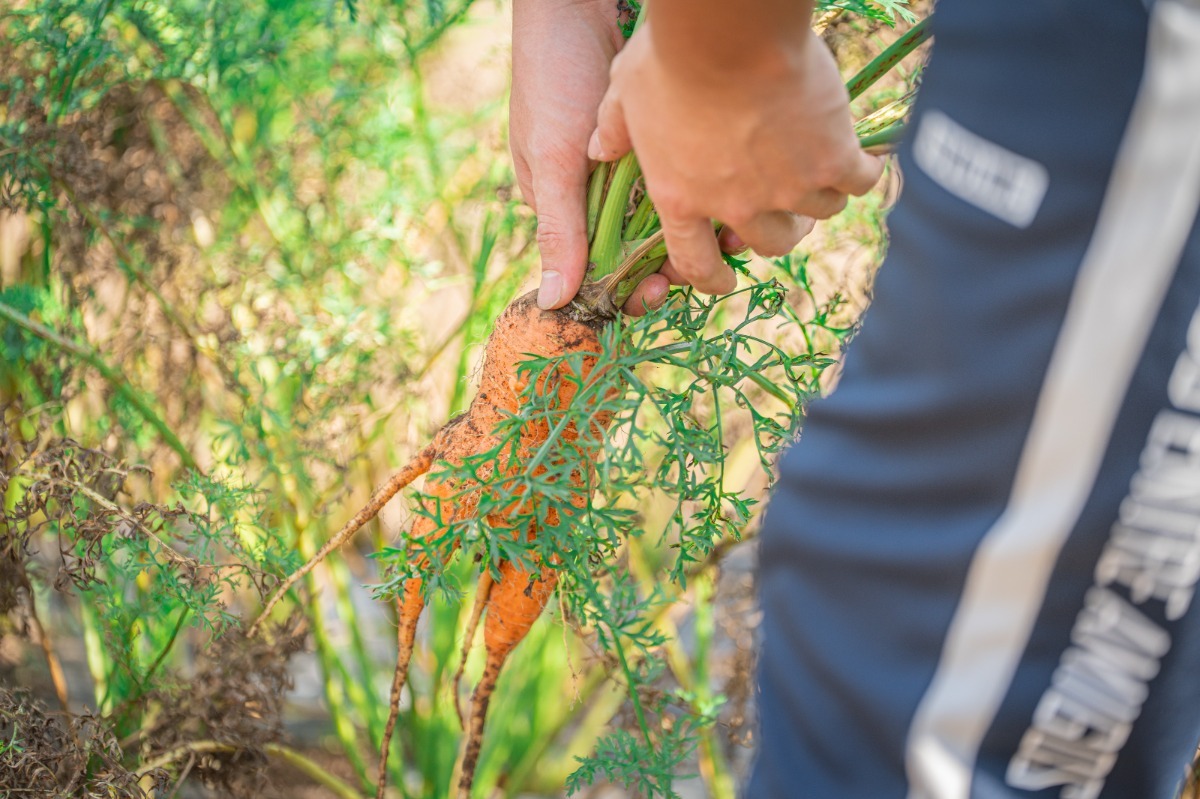 ──そして昼には、畑で土に触れる体験を。