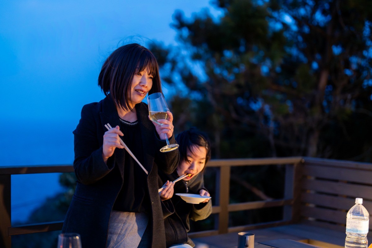 沖ノ島を望むテラスのファイヤーピットでは、BBQや焚き火が楽しめます。玄界灘に浮かぶ「神守る」島、福岡県宗像市大島。