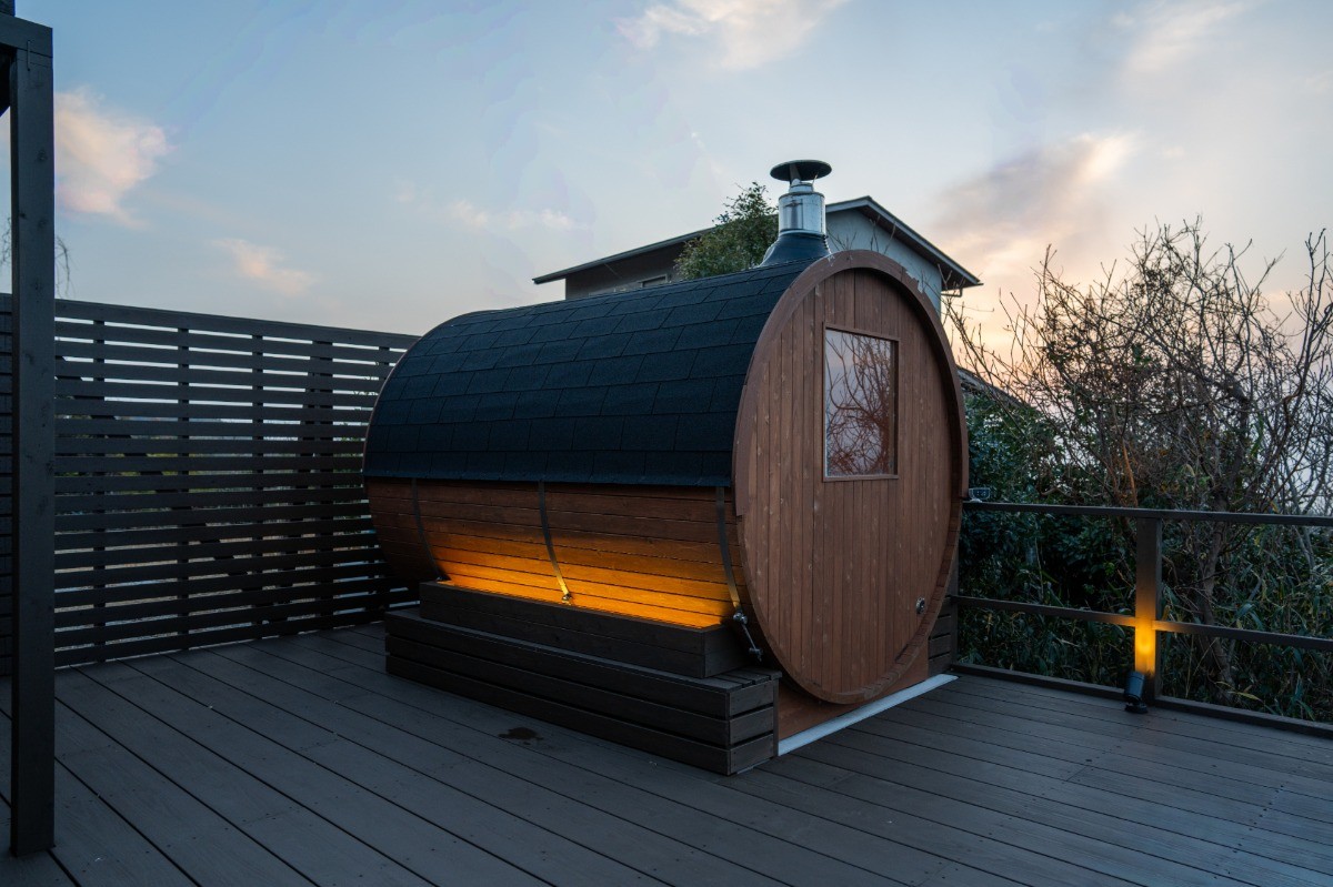 テラスには、海を一望するバレル薪サウナ室内のアメニティや寝具は厳選し、THANN、IKEUCHI ORGANICなど、環境に配慮した上質なアメニティをご用意しました。余計なものを手放すことで生まれる時間。静けさの中で、深く、豊かな滞在をお約束します。