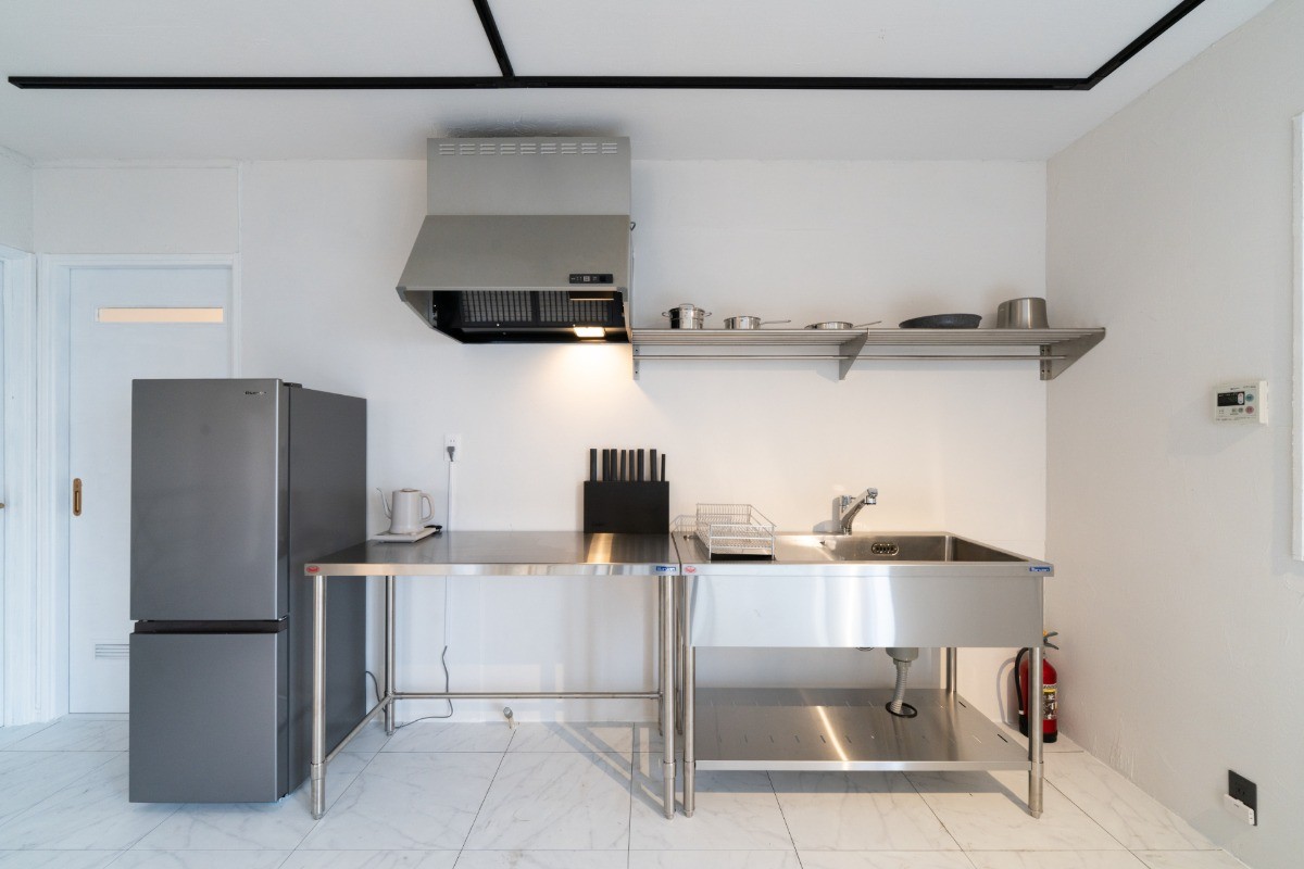 キッチンはシンプルなステンレス製。調理器具も一式ご用意しております。