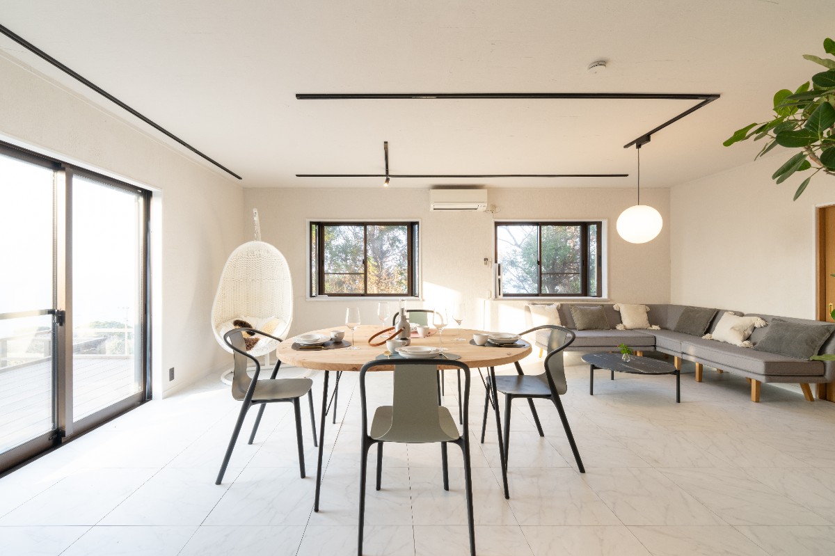 ダイニングとリビングは緩やかにつながり、最大6名までゆったりと滞在可能。友人同士、家族、あるいは少人数での特別な集まりにもぴったりです。