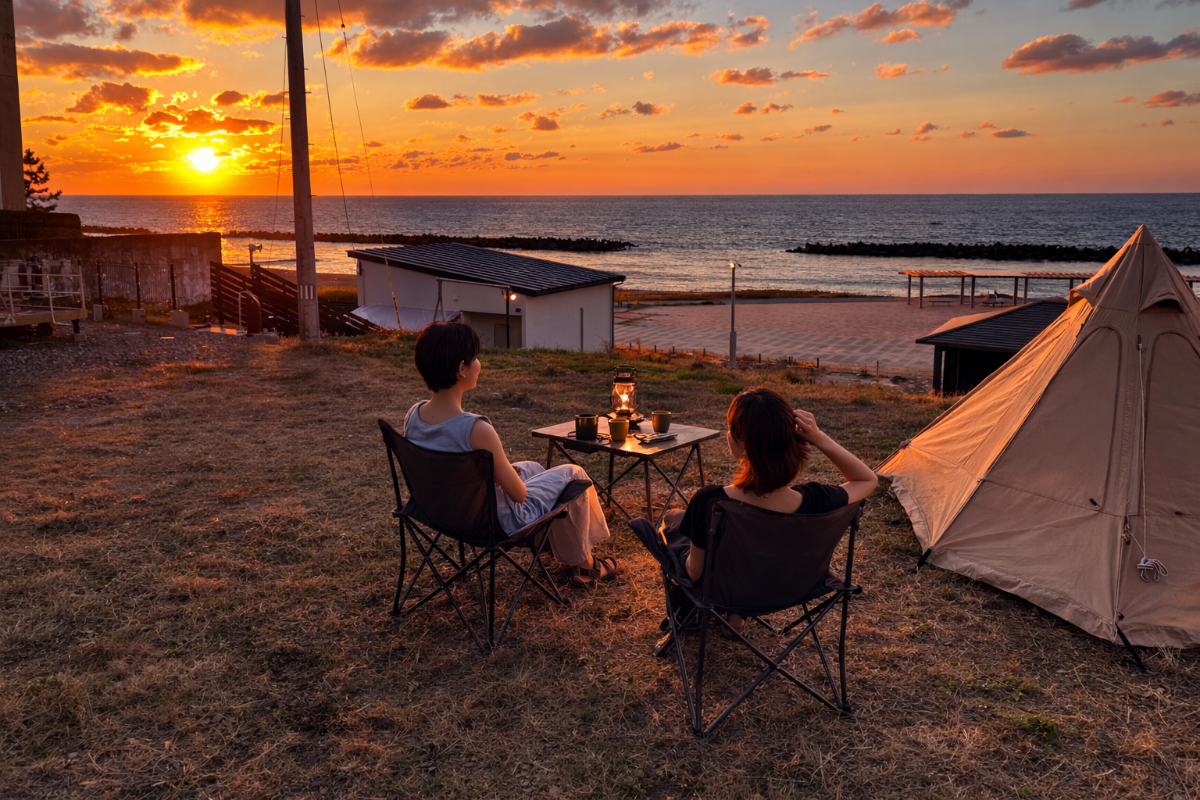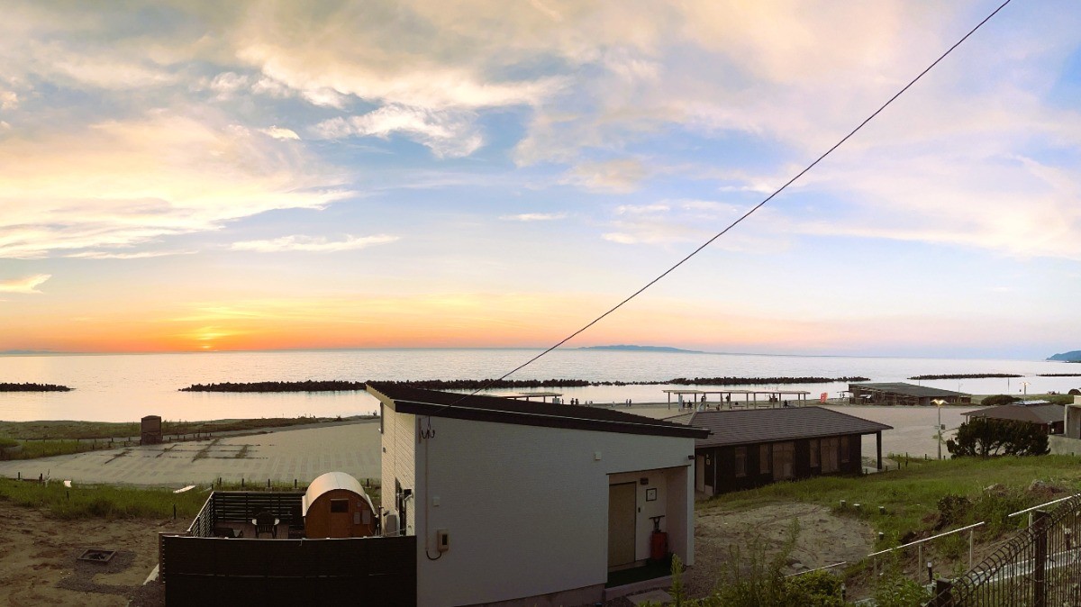 「海まで徒歩0分、波音と眠る夜。」 海水浴場に隣接した開放感あふれるビーチサイドキャンプ。焚き火の火越しに眺める水平線は、一生モノの思い出に。