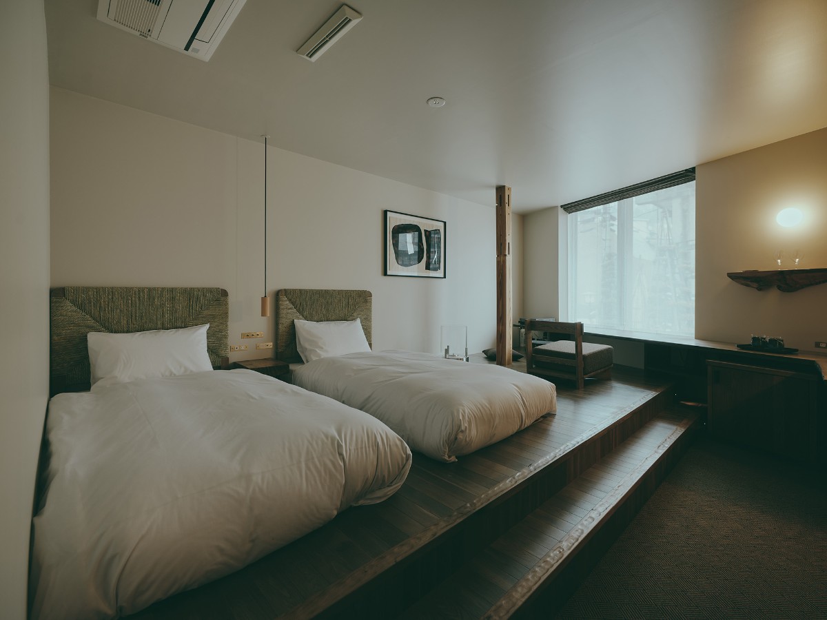 窓から差し込むやわらかな光に包まれた空間には、小上がりスペースとツインベッドを備え、ご友人やご家族でゆったりとお過ごしいただけます。