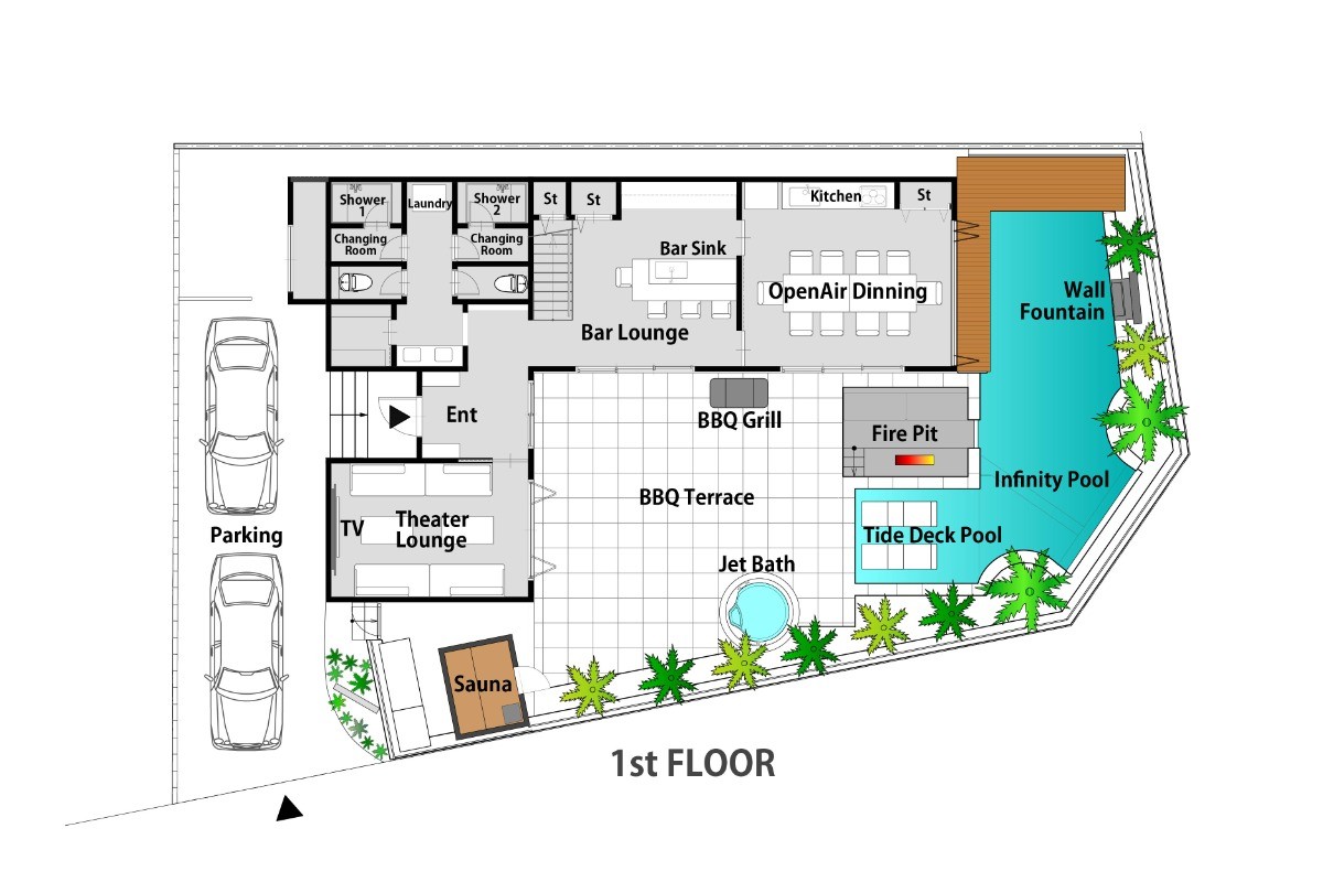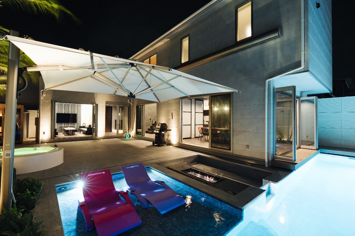 敷地内に一歩入れば、水と植物に囲まれたリゾート空間が広がります。プールはもちろん、サウナやジャグジー、BBQ設備も完備しています。その他、屋内外に様々なアメニティもご用意しています。是非、非日常から解放されたお時間をお過ごしください。