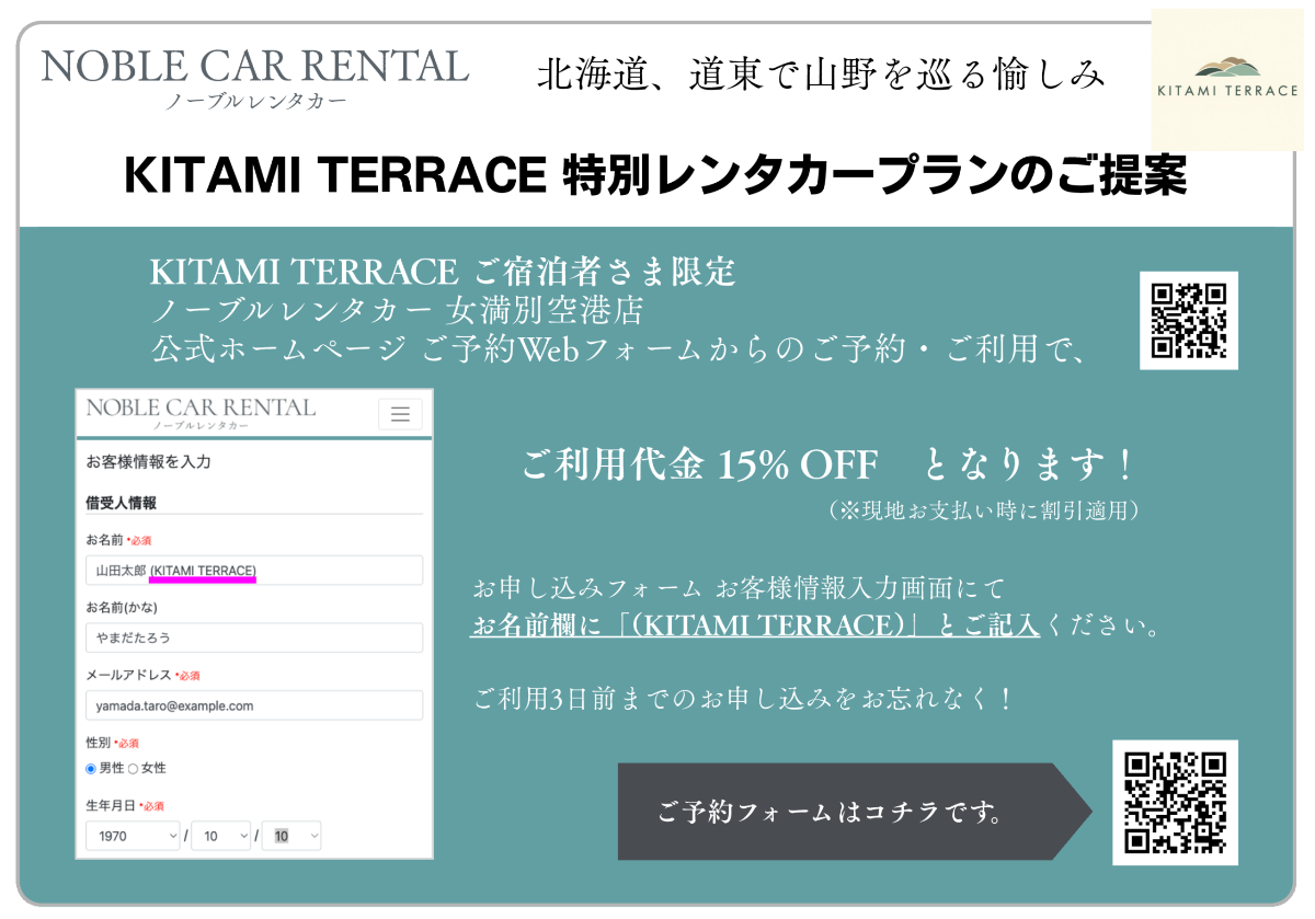 今回ノーブルレンタカー女満別空港店様と提携させていただきました。公式ホームページご予約Webフォームからのご予約・ご利用で、ご利用代金15%OFFとなります。(※現地お支払い時に割引適用)
