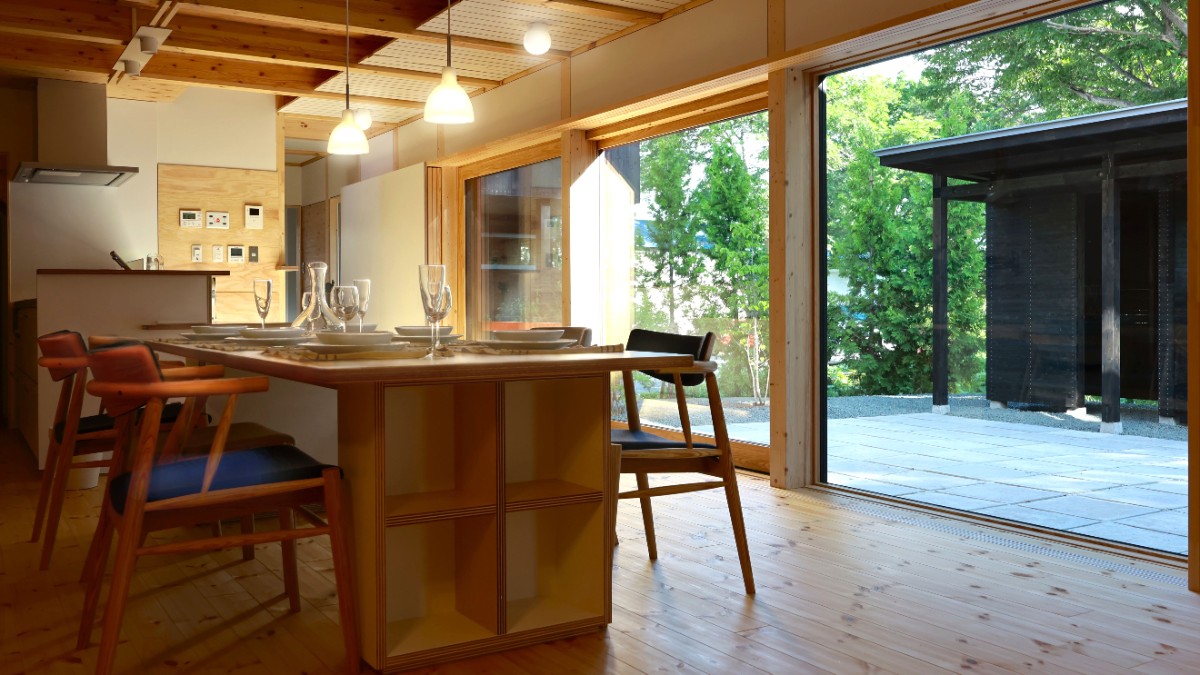 建物は、北見の中心部にほど近いながらも木々に囲まれた穏やかな場所に建てられており、季節ごとに姿を変える木々の色彩が大きな窓から広がります。