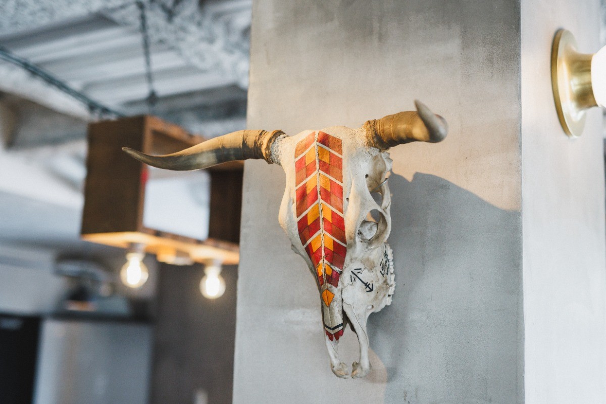 象徴的なのが、THE MILL の中で最も印象的な「バッファロースカル」のアートピース。ネイティブアメリカンの伝統的なお守りとして使われてきたモチーフで、1980年代頃には静岡のとあるレストランに飾られ、そして2016年頃からは、この場所を見守ってくれています。
