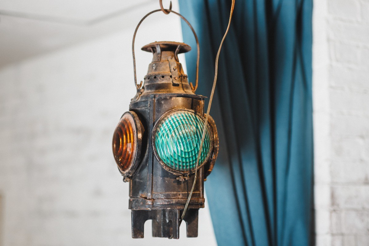 上部には工場感の強い蛍光灯ランプがあり、白い光がテーブルをきりっと照らします。その姿は、どこか映画のセットの小道具のような存在感。