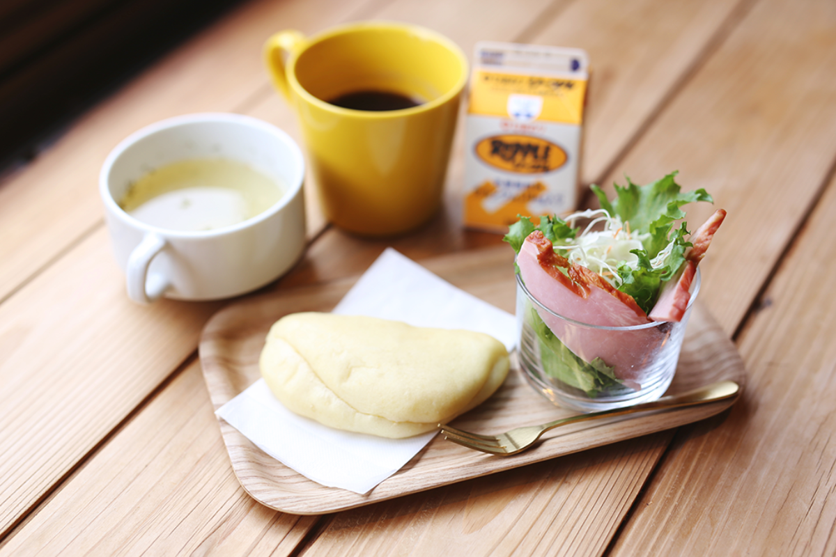 We offer a breakfast set that includes focaccia bread infused with yuzu citrus, a side dish, and a drink.