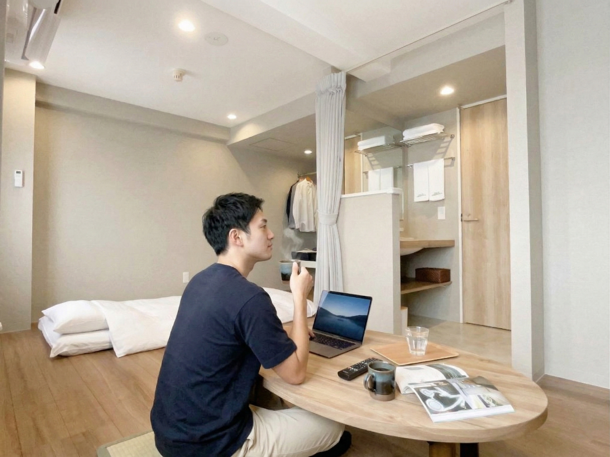 靴を脱いで過ごすスタイルは、広いお部屋だとさらに快適!ユニットバスで汗を流した後は、ご自宅のように素足でリラックス。明日の仕事への活力をチャージしてください。