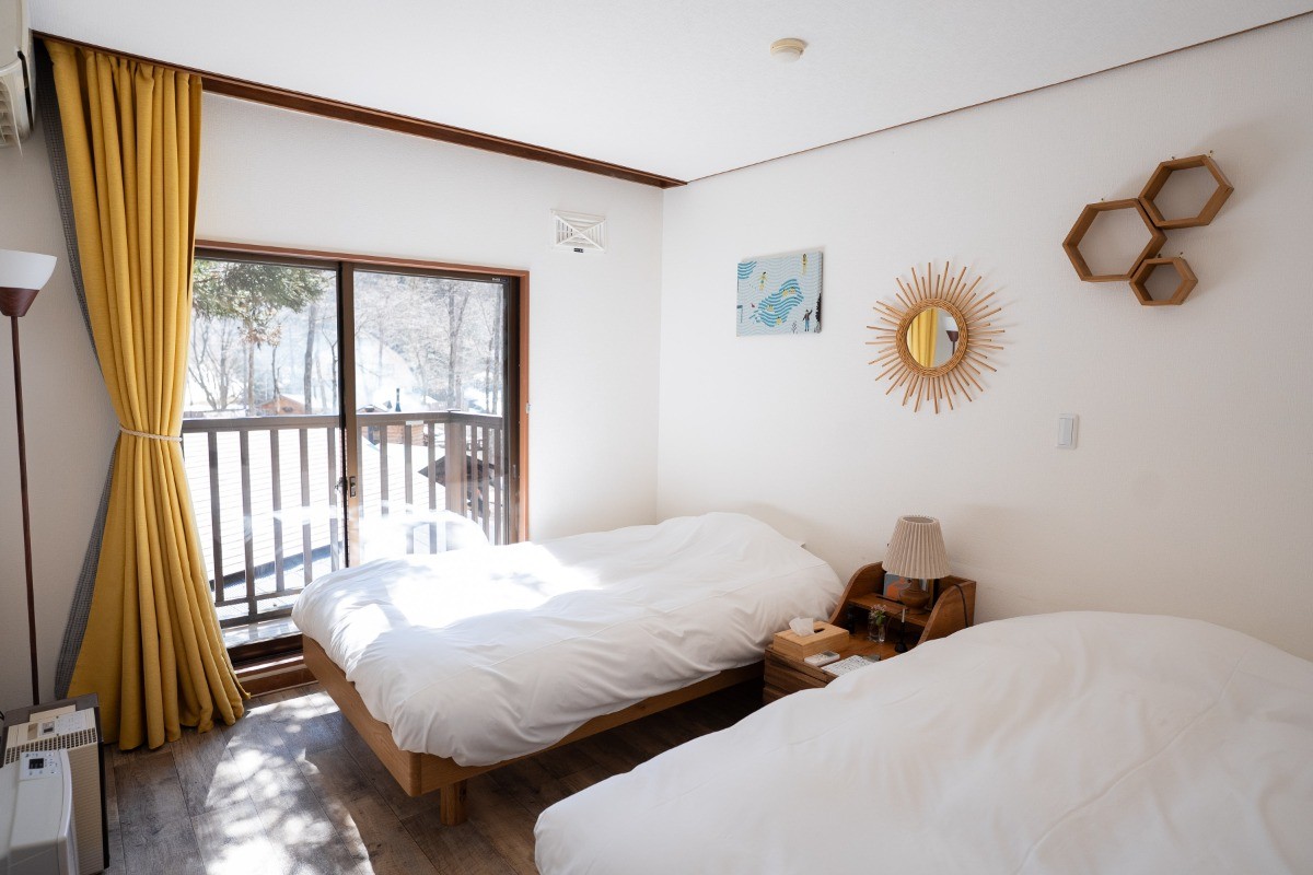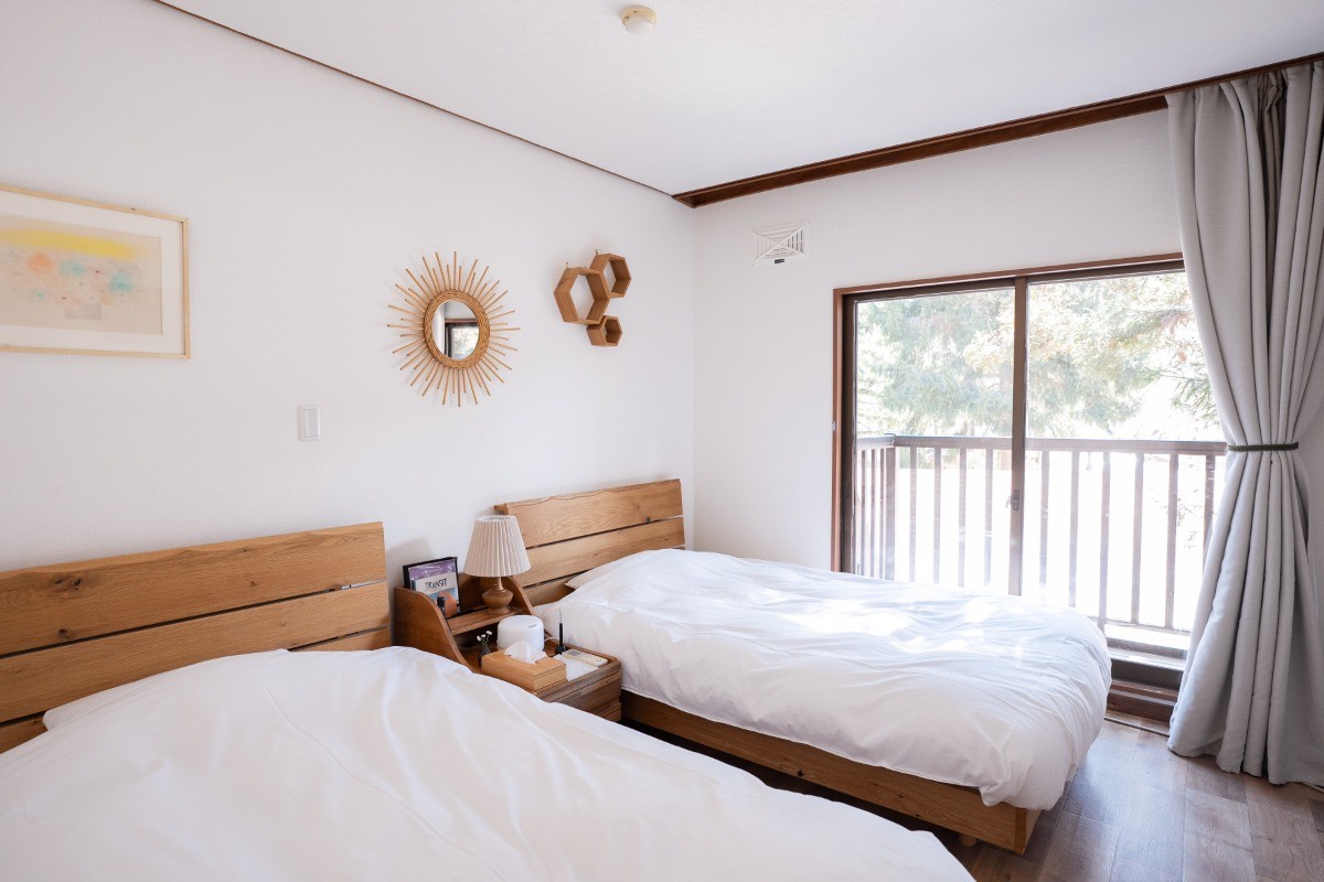 お部屋には大きなシングルベッドが2台備え付けられており、最大2名様までお泊まりいただけます。バルコニーも付いております。※トイレ、バスルームは共有となります。