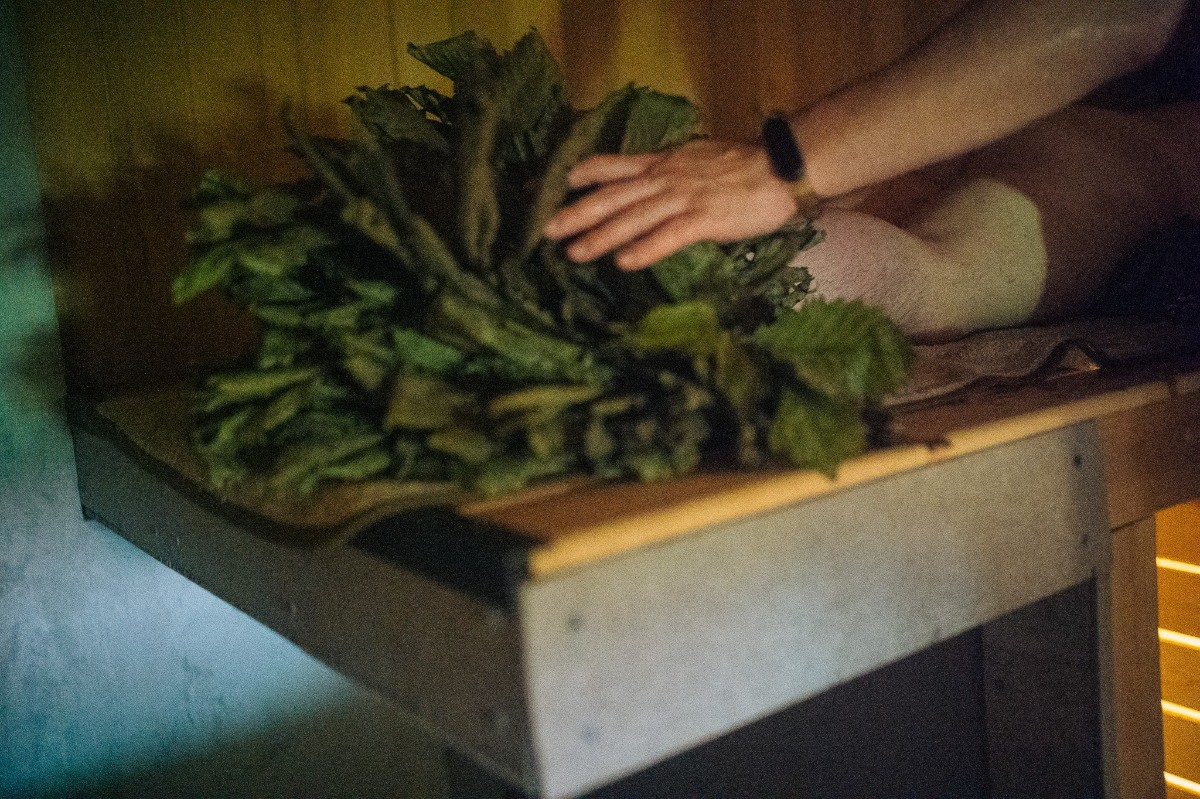 蒸気で温めたヴィヒタが肌に触れるたび、白樺の甘い香りがふわりと広がる。