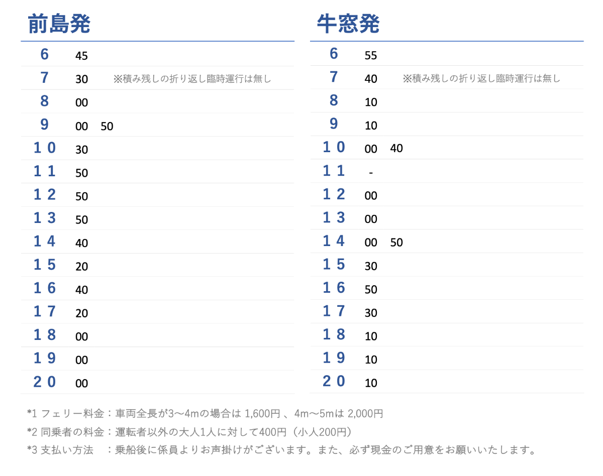 当施設は離島にありますが、自家用車も乗り入れることができるフェリーが定期運行(朝は6:45〜夜は20:10まで)されています。乗船時間はおよそ5分ですが、乗船券の購入には現金が必要です。港から当施設までは坂道も多いため、お車でのお越しをお勧めしております(送迎はございません)。 【フェリー料金と時刻表】 https://www.maejima-island.info/schedules.html