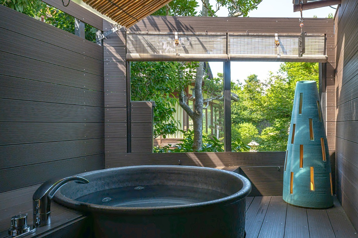 貸切の露天風呂からは美しい日本庭園を臨め、四季折々の風景をお楽しみいただきながら、ごゆっくりお寛ぎいただけます。