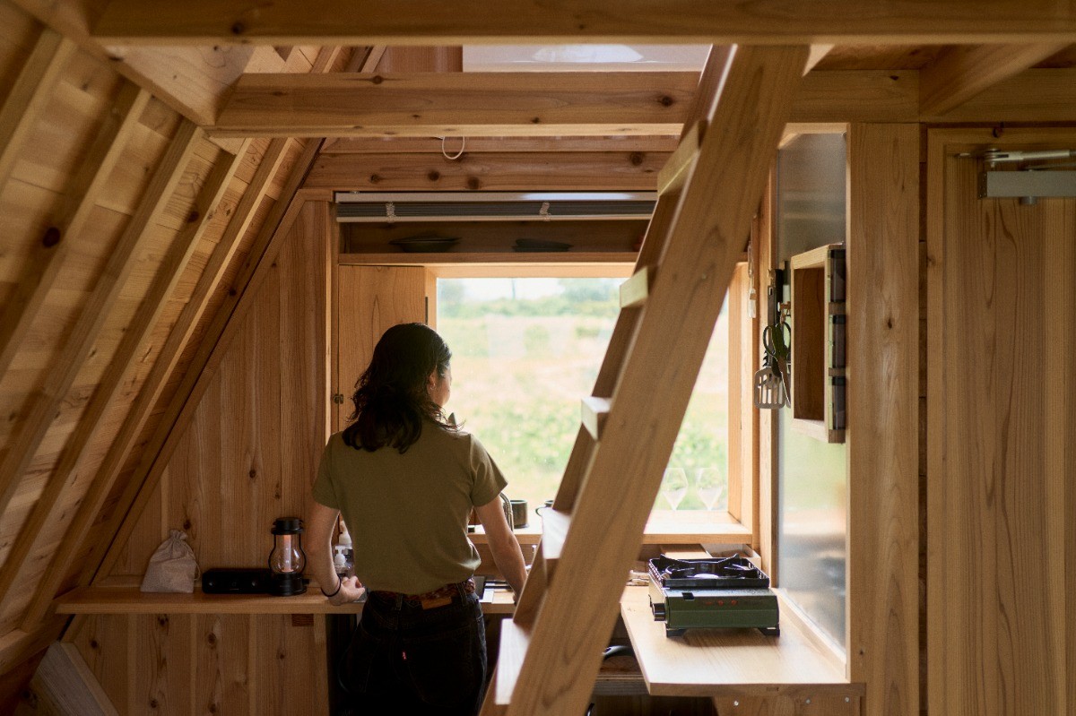 Nutshellの設備はベッド、テーブル、簡易のキッチンのみと最小限となっております。室内はコンパクトな設えで、ロフトにベッドルームがあります。ご自身のキャンプギアやアイテムを持ち込んでさまざま工夫しながら楽しむ方法もおすすめです。