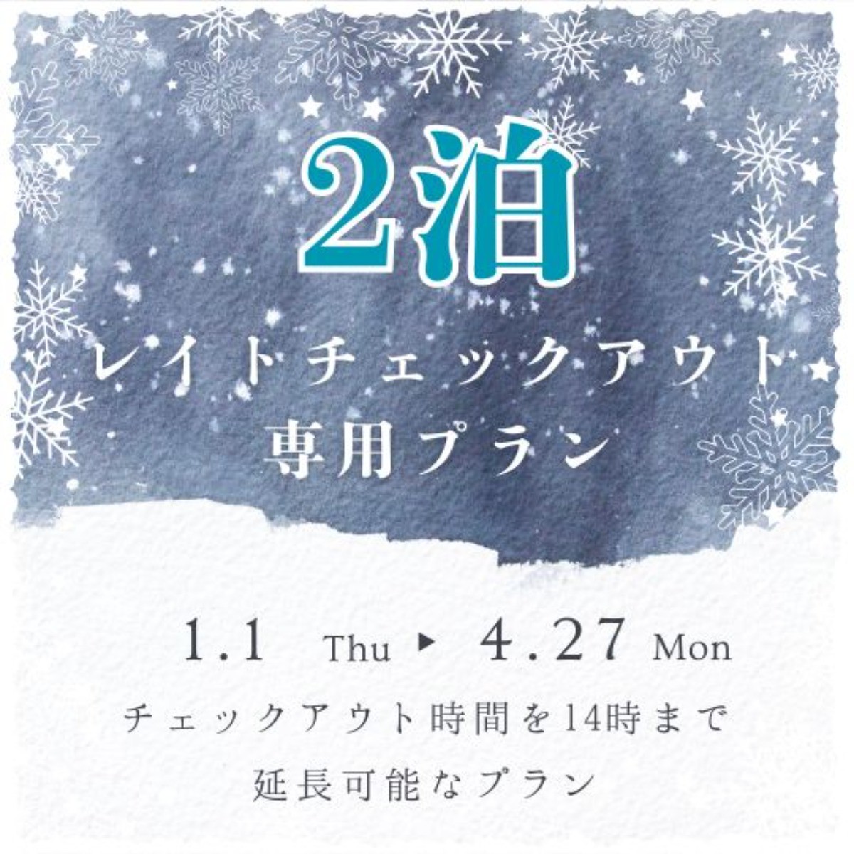 例)2026年1月1日〜1月3日(2泊)ご宿泊希望で、レイトチェックアウトプランをご予約されますと、ご宿泊日程が2026年1月1日〜1月4日と連絡がきますが、2026年1月1日〜1月3日の2泊ご予約ということになります。
