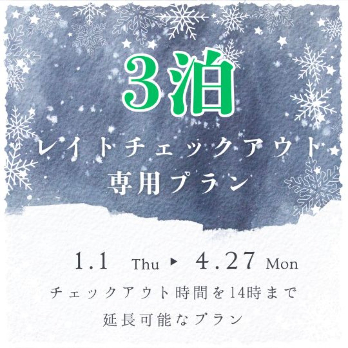 例)2026年1月1日〜1月4日(3泊)ご宿泊希望で、レイトチェックアウトプランをご予約されますと、ご宿泊日程が2026年1月1日〜1月5日と連絡がきますが、