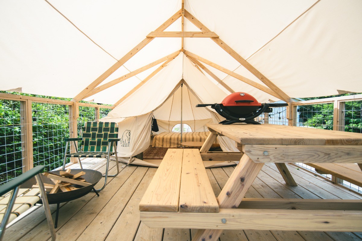 お部屋は木製にオリジナルデッキで上質なキャンプ体験ができるグランピングタイプで、エアコンも完備しておりますので快適にお過ごしいただけます。