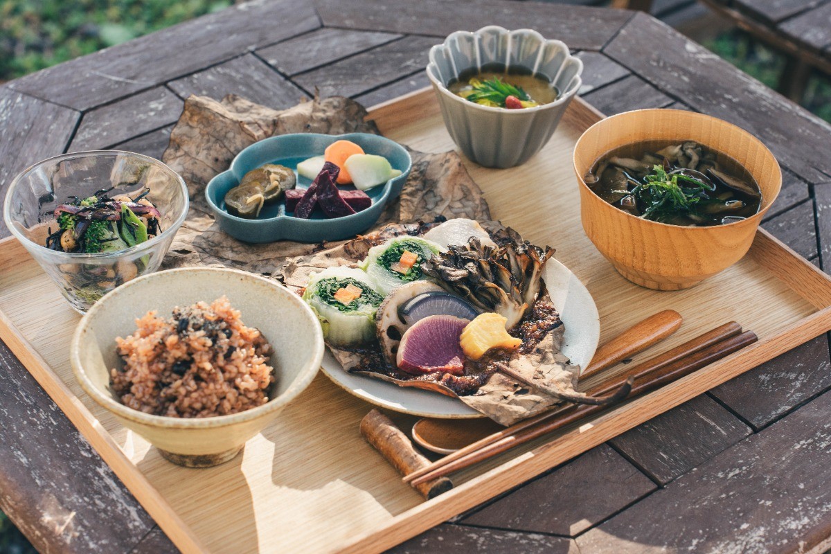 里カフェではお野菜メインの身体にやさしい玄米菜食ランチ。チェックアウト後も散策やランチでMahora稲穂山をお楽しみいただけます。