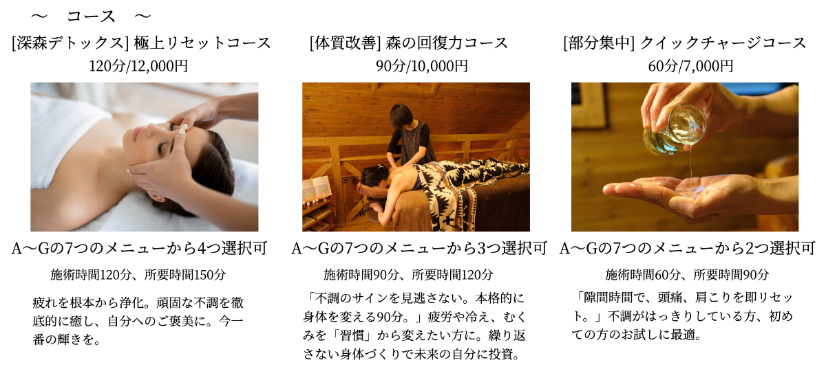 A〜Gのお好きなメニューを選択する事によりあなた好みのコースをご体感頂くことが出来ます。