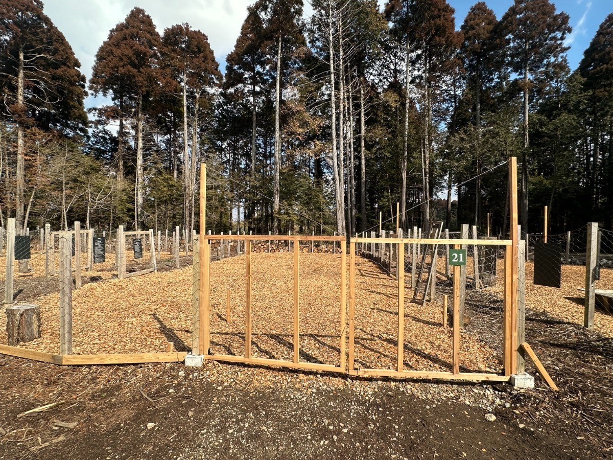森林に囲まれた、ドッグランサイト。全面ウッドチップで、2サイト以上ご予約の場合は隣とのサイトとも連結可能な