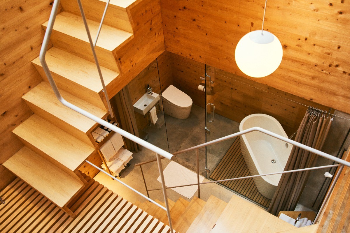 階段を上り下りした先にあるバスルーム