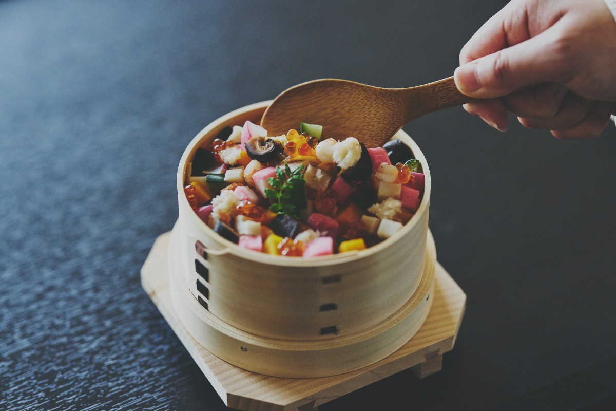 「菓寮 浮雲」では、曲水の宴をイメージした空間で丹後の風土を繊細に表現した、郷土食であるばら寿司にインスパイアされた御膳をお楽しみいただけます。