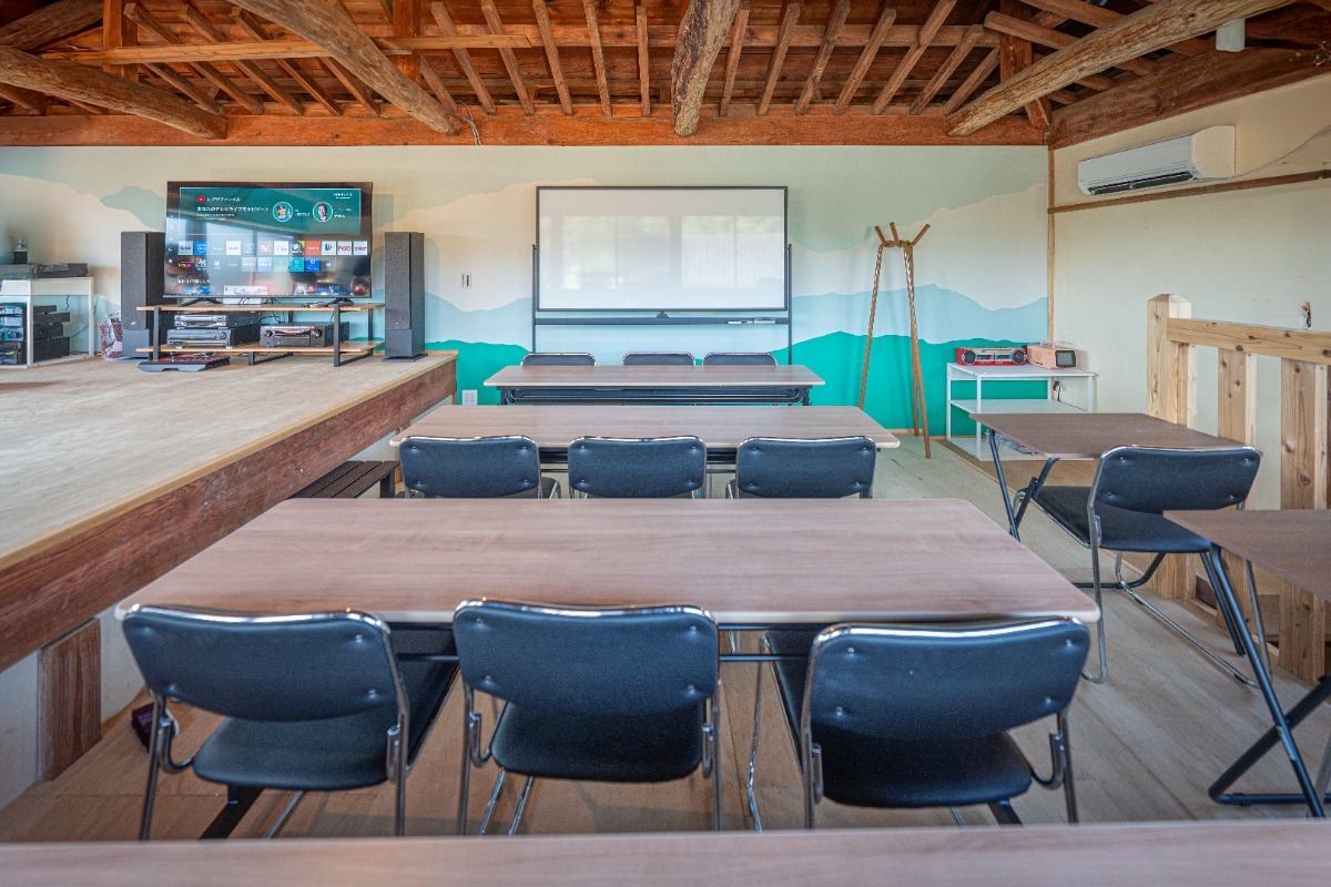 会議机と椅子、大型スクリーン、ホワイトボードもおいておりますので企業研修や合宿にも利用可能です